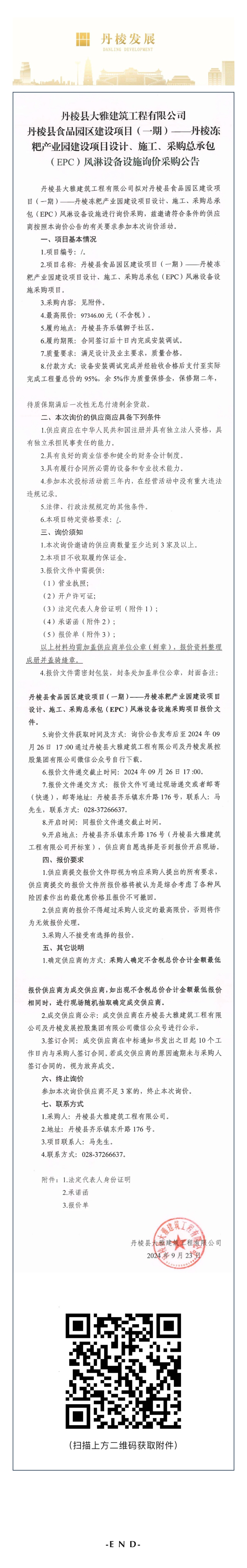縣大雅建筑公司丹棱縣食品園區(qū)建設(shè)項(xiàng)目(一期)—丹棱凍粑產(chǎn)業(yè)園建設(shè)項(xiàng)目設(shè)計(jì)、施工、采購總承包(EPC)風(fēng)淋設(shè)備設(shè)施詢價(jià)采購公告