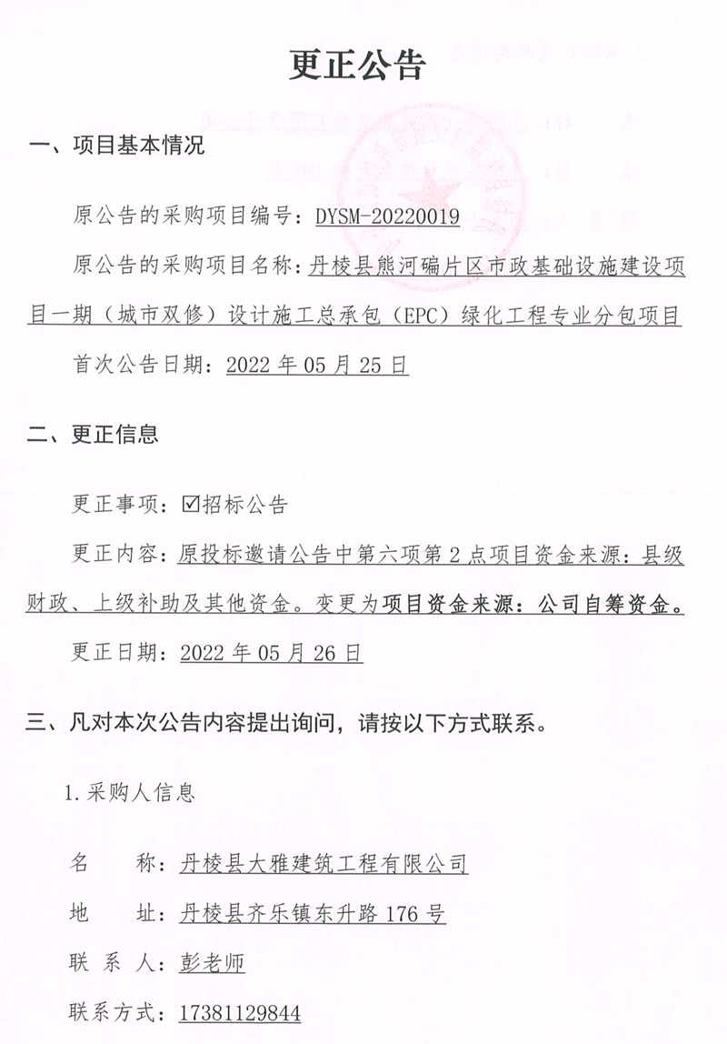 丹棱縣熊河碥片區(qū)市政基礎設施建設項目一期(城市雙修)設計施工總承包(EPC)綠化工程專業(yè)分包項目更正公告