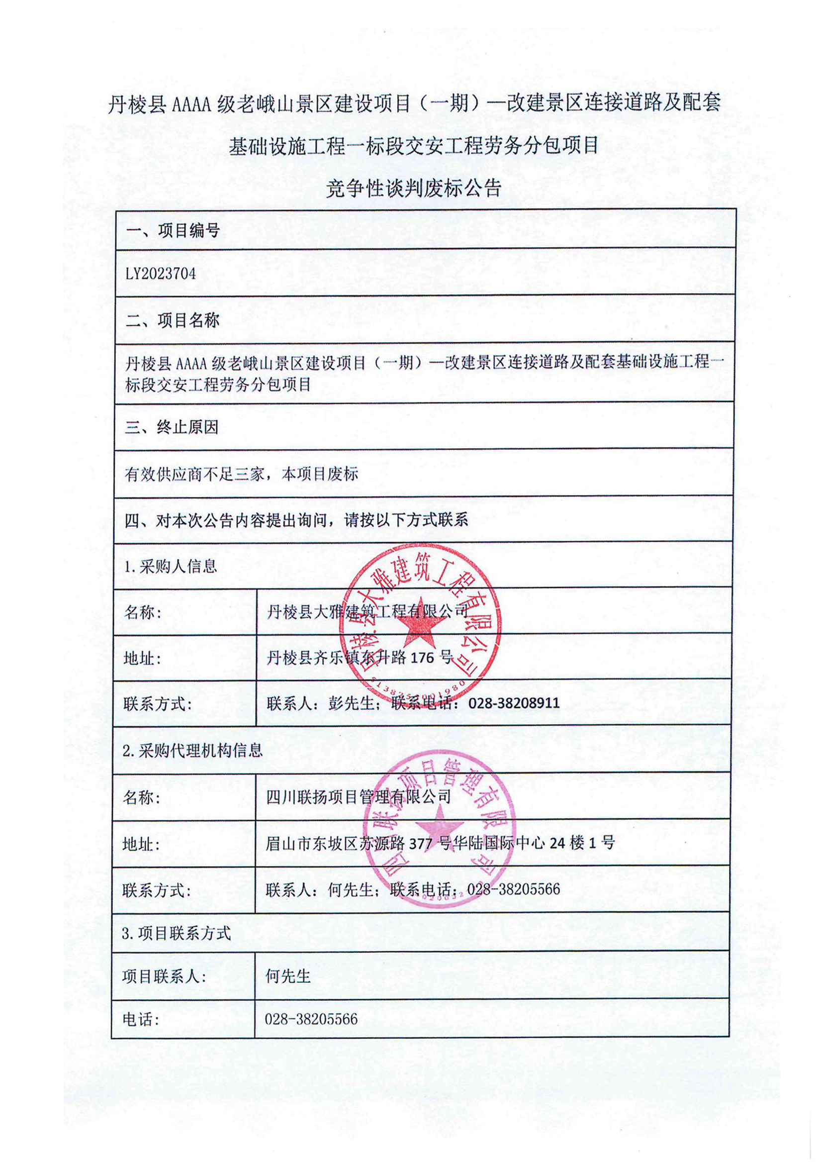 丹棱縣AAAA級老峨山景區(qū)建設項目(一期)一改建景區(qū)連接道路及配套基礎設施工程一標段交安工程勞務分包項目競爭性談判廢標公告