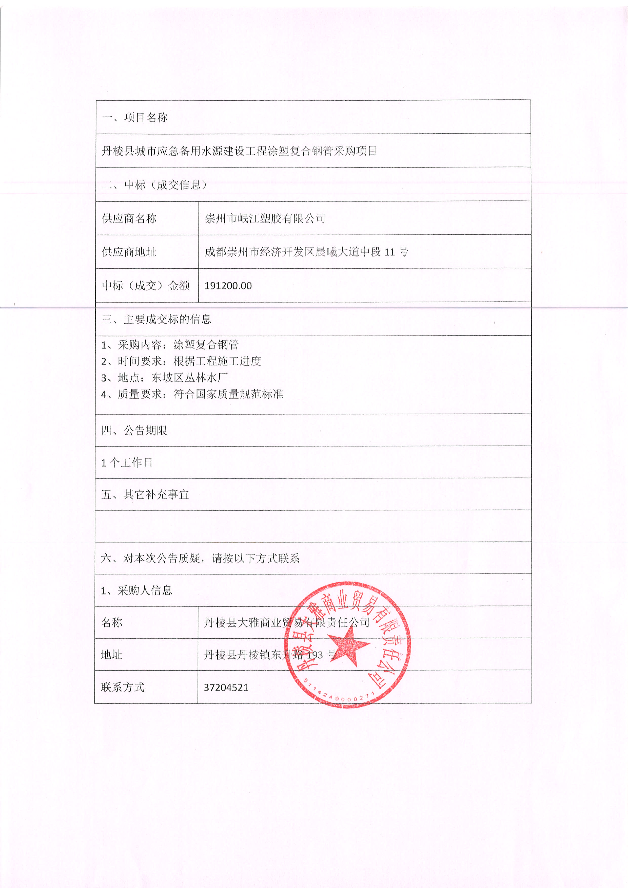 【大雅商貿(mào)公司】丹棱縣城市應(yīng)急備用水源建設(shè)工程涂塑復(fù)合鋼管采購項(xiàng)目中標(biāo)結(jié)果公示