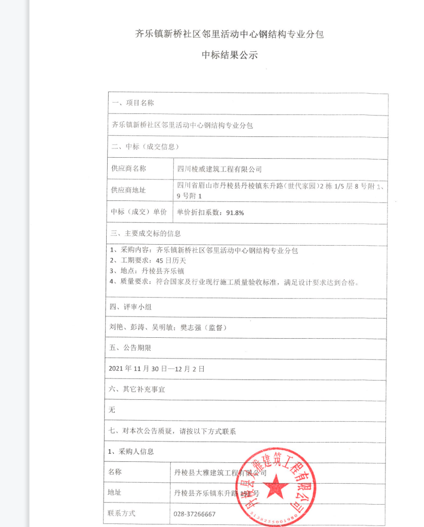 【大雅建筑公司】齊樂鎮(zhèn)新橋社區(qū)鄰里活動中心鋼結(jié)構(gòu)專業(yè)分包中標(biāo)結(jié)果公示