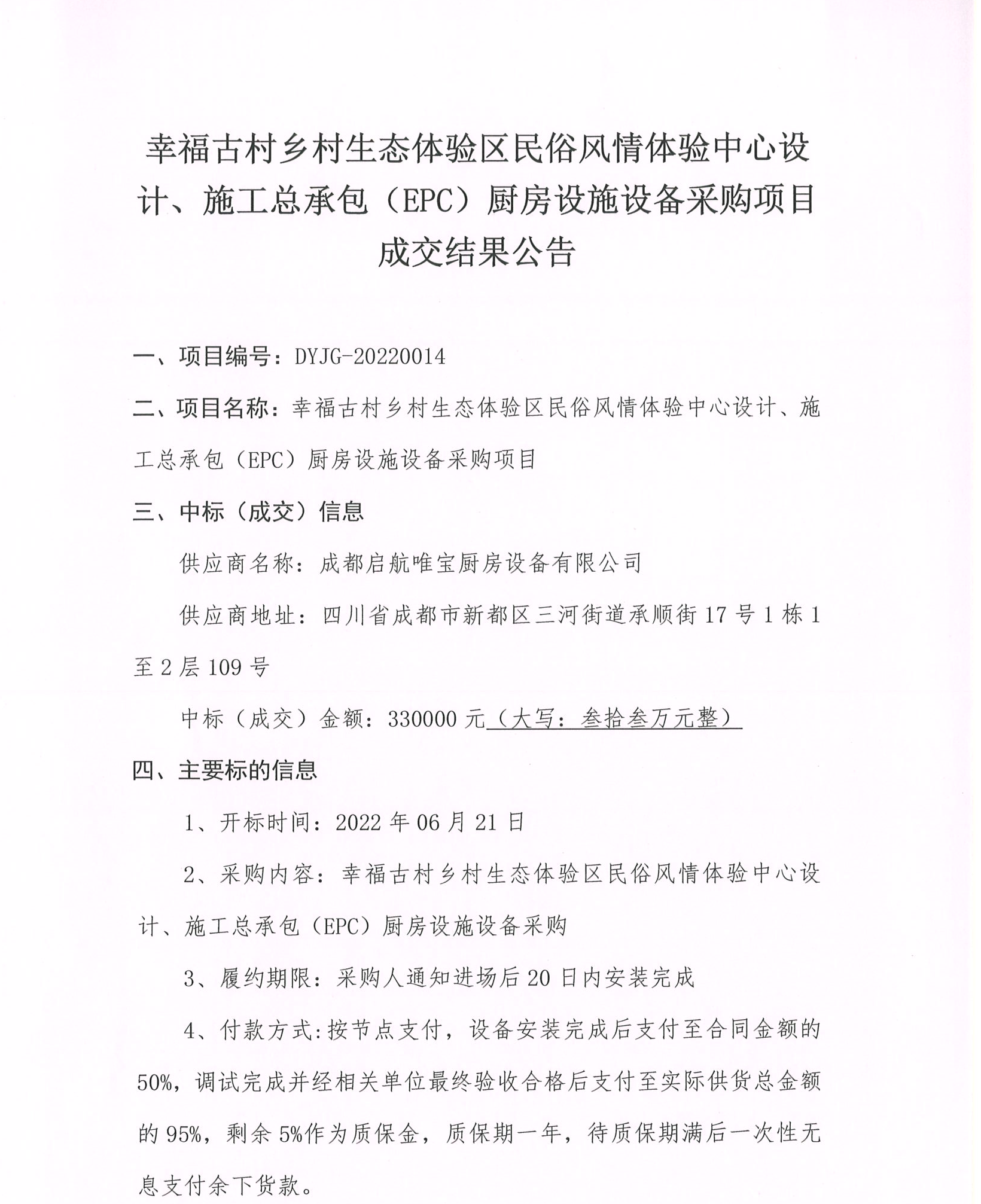 幸福古村鄉(xiāng)村生態(tài)體驗(yàn)區(qū)民俗風(fēng)情體驗(yàn)中心設(shè)計(jì)、施工總承包(EPC)廚房設(shè)施設(shè)備采購項(xiàng)目成交結(jié)果公告