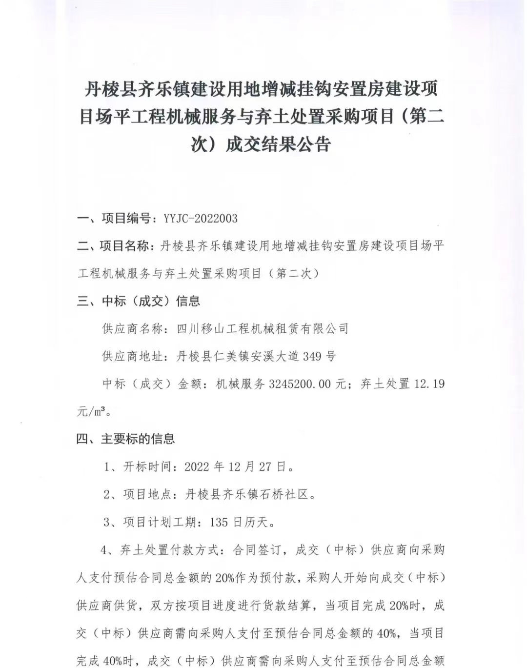 丹棱縣齊樂鎮(zhèn)建設用地增減掛鉤安置房建設項目場平工程機械服務與棄土處置采購項目(第二次)成交結果公告