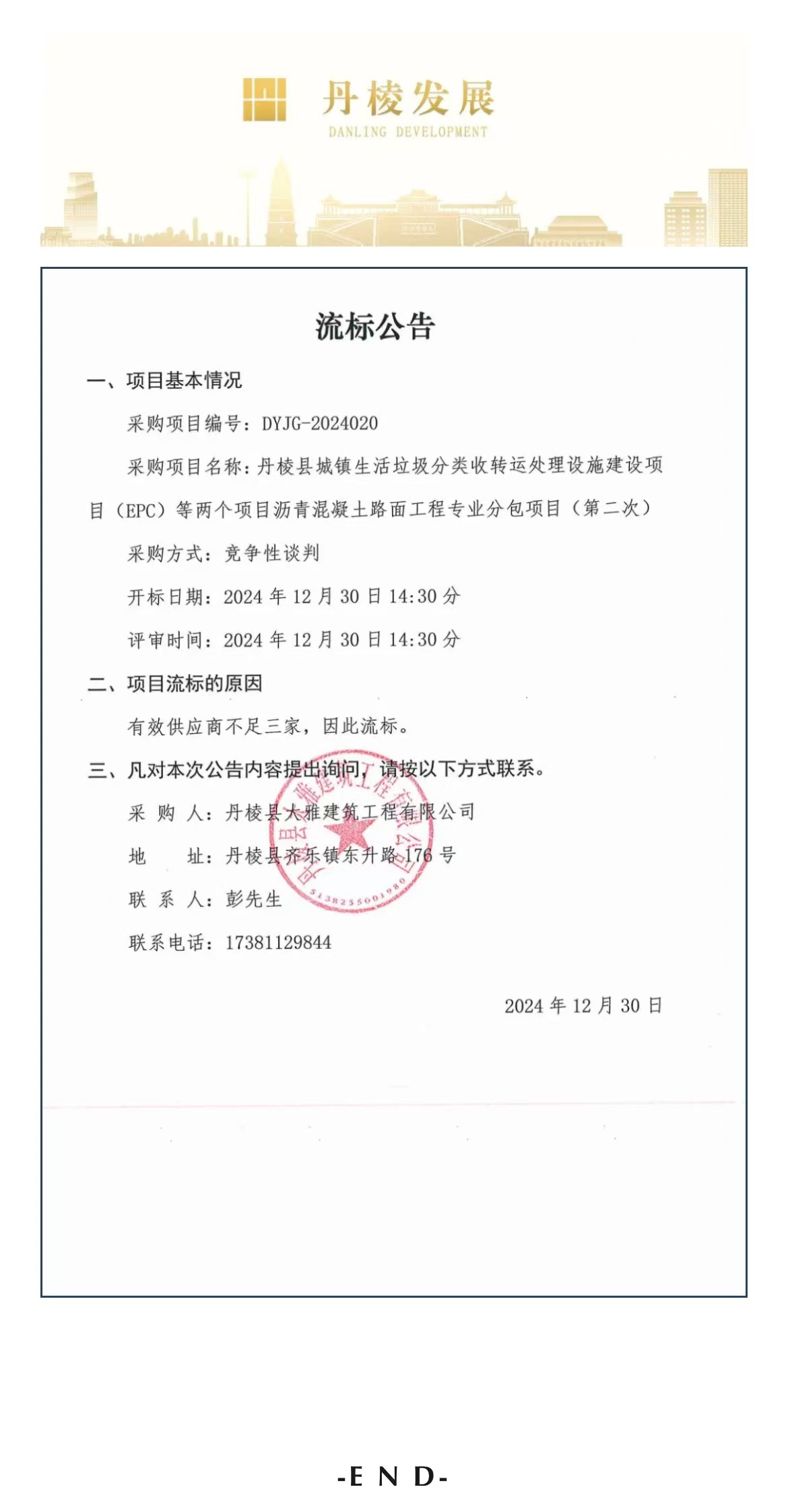 丹棱縣城鎮(zhèn)生活垃圾分類收轉(zhuǎn)運(yùn)處理設(shè)施建設(shè)項(xiàng)目(EPC)等兩個(gè)項(xiàng)目瀝青混凝土路面工程專業(yè)分包項(xiàng)目(第二次)流標(biāo)公告