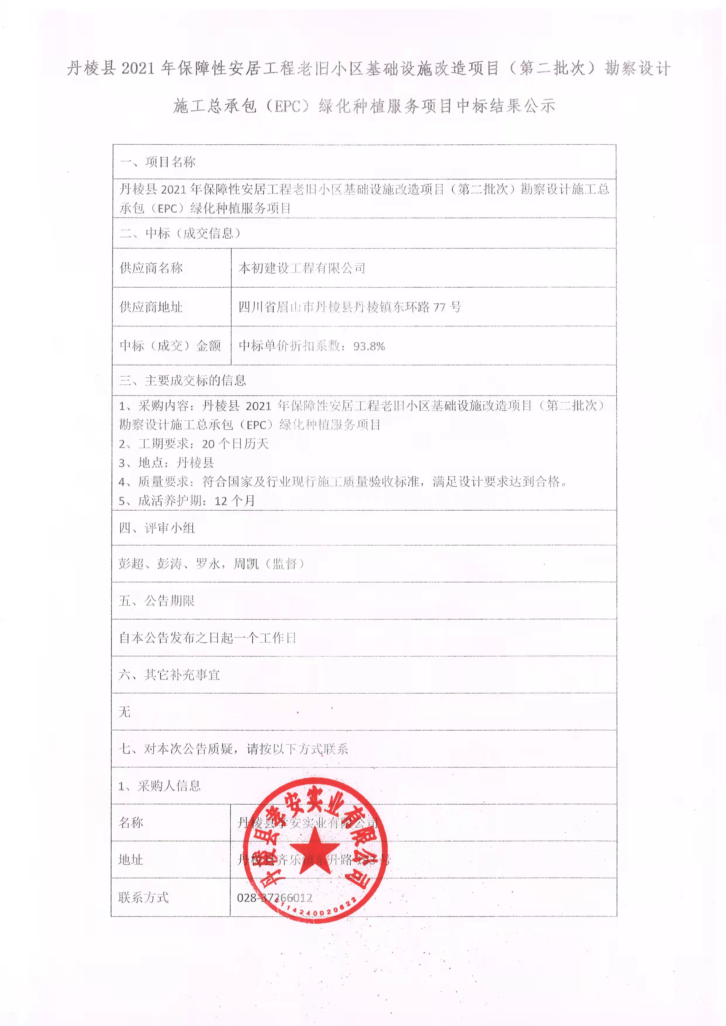 【縣孝安公司】丹棱縣2021年保障性安居工程老舊小區(qū)基礎設施改造項目(第二批次)勘察設計施工總承包(EPC)綠化種植服務項目中標結果公示