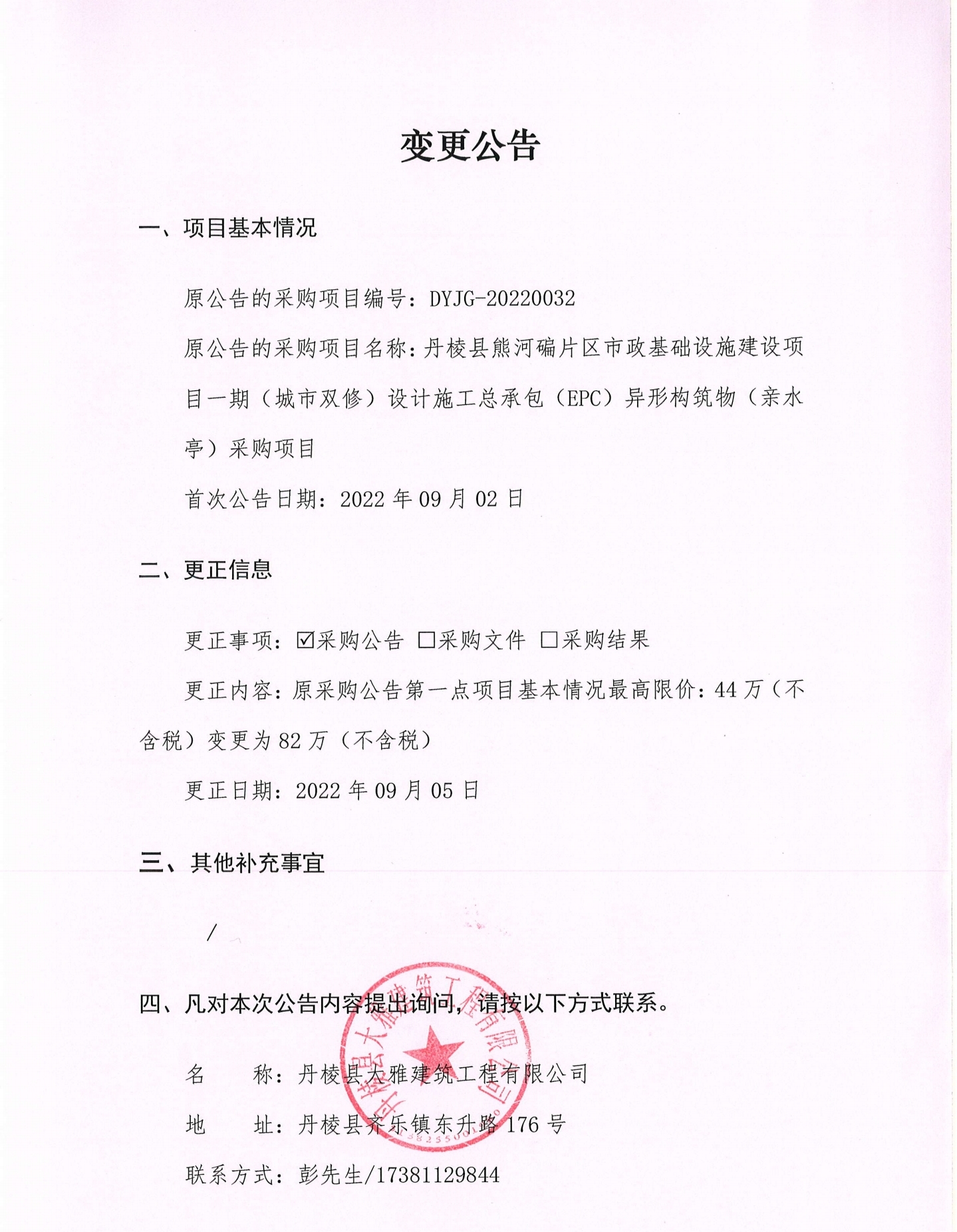 丹棱縣熊河碥片區(qū)市政基礎(chǔ)設(shè)施建設(shè)項目一期(城市雙修)設(shè)計施工總承包(EPC)異形構(gòu)筑物(親水亭)采購項目變更公告
