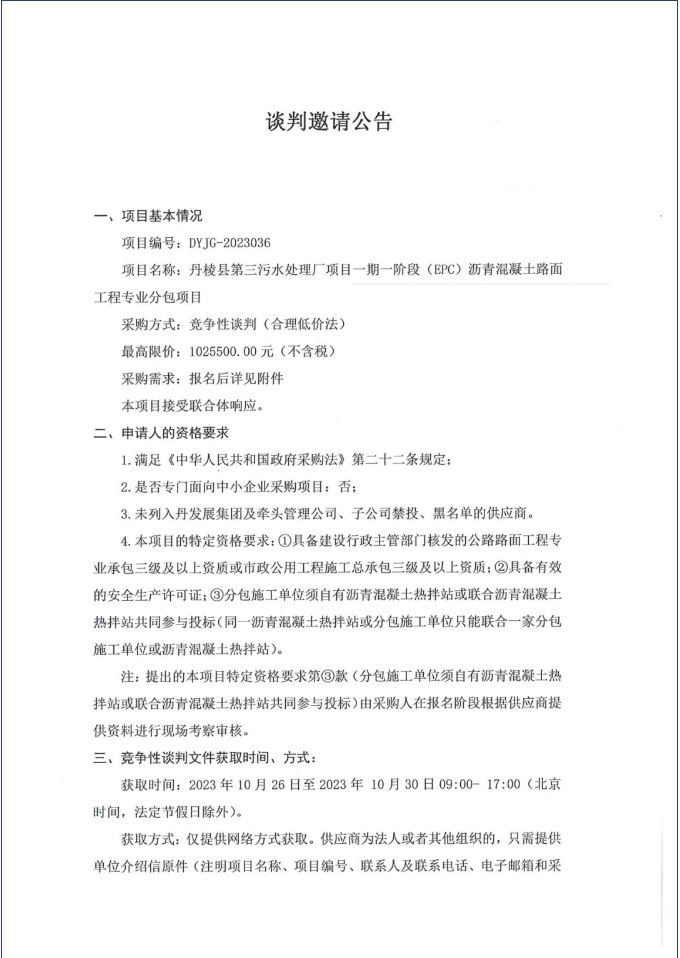 丹棱縣第三污水處理廠項目一期一階段(EPC)瀝青混凝土路面工程專業(yè)分包項目談判邀請公告