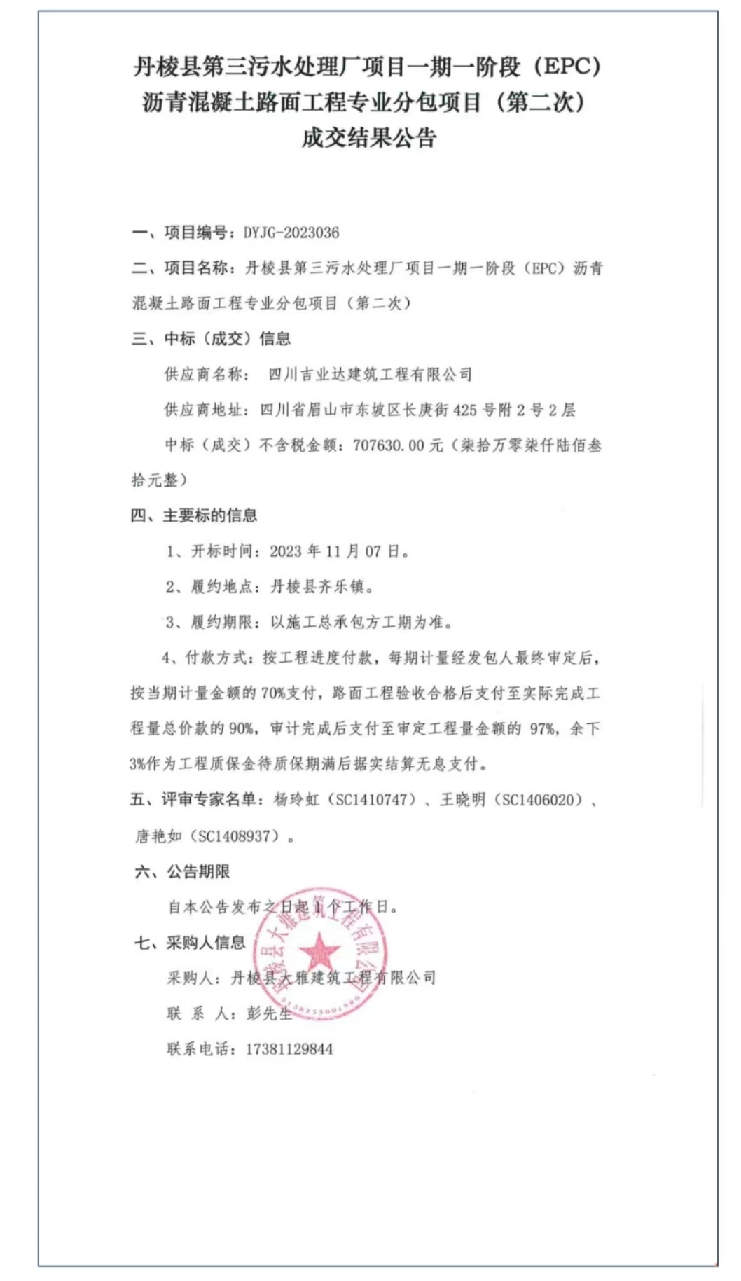 丹棱縣第三污水處理廠項目一期一階段(EPC)瀝青混凝土路面工程專業(yè)分包項目(第二次)成交結果公告