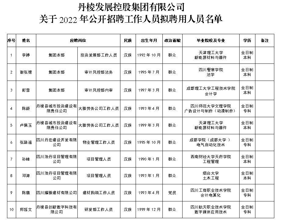附件:丹棱發(fā)展控股集團有限公司關(guān)于2022年公開招聘工作人員擬聘用人員名單